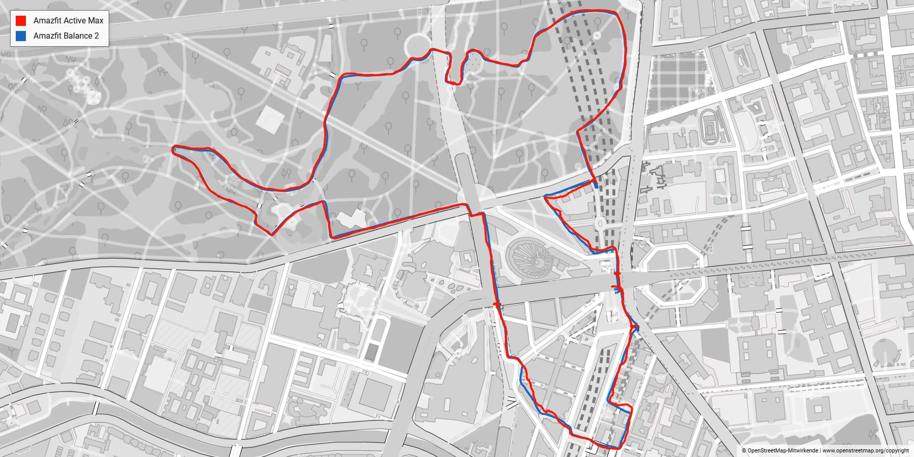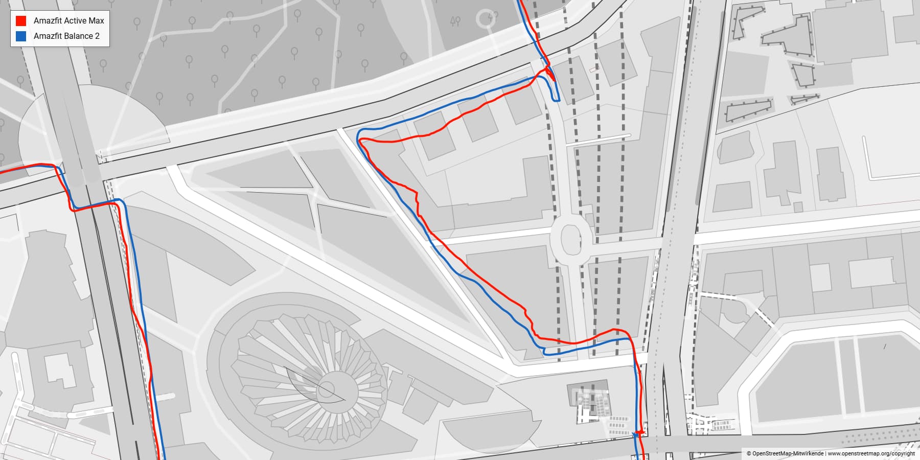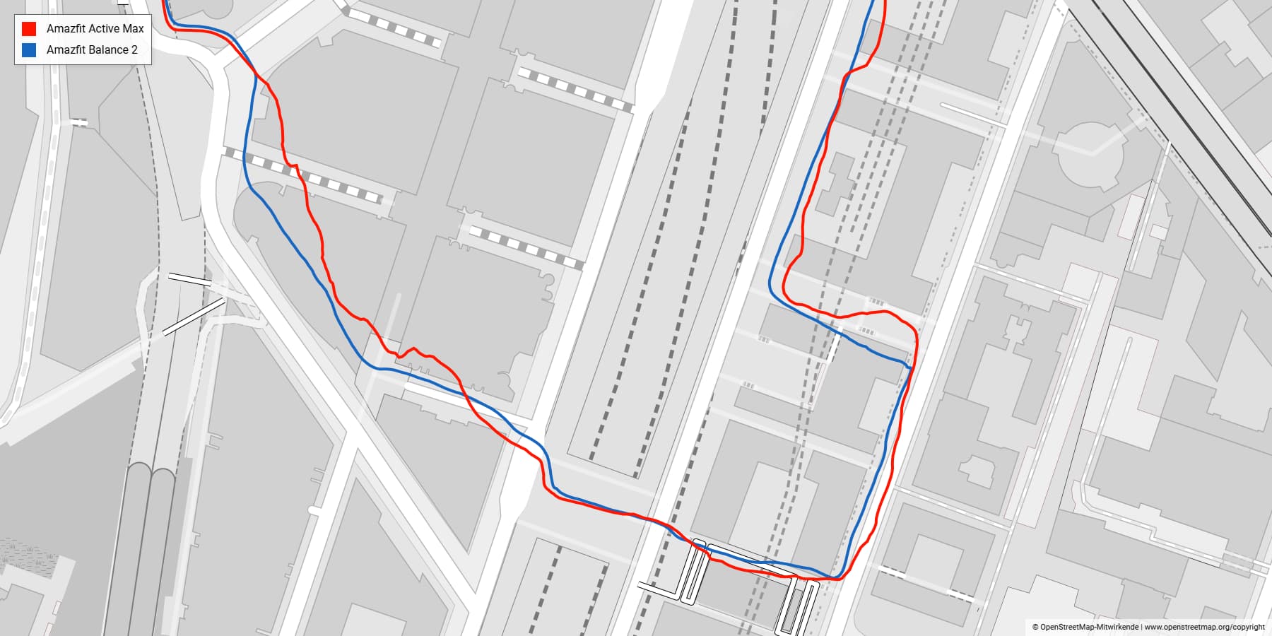 Aus großer Höhe fällt der Vergleich zwischen Active Max und Balance 2 unauffällig auf. Erst auf den zweiten Blick merkt man der Active Max das Fehlen des Dual-Band-GPS deutlich an. Die engen Straßen bzw. Nähe zu den hohen Gebäuden setzt die Active Max unter Stress. Der Streckenverlauf wirkt deutlich unruhiger, auch wenn es in den meisten Fällen nur geradeaus ging. Die Balance 2 hingegen schlägt sich tapfer.