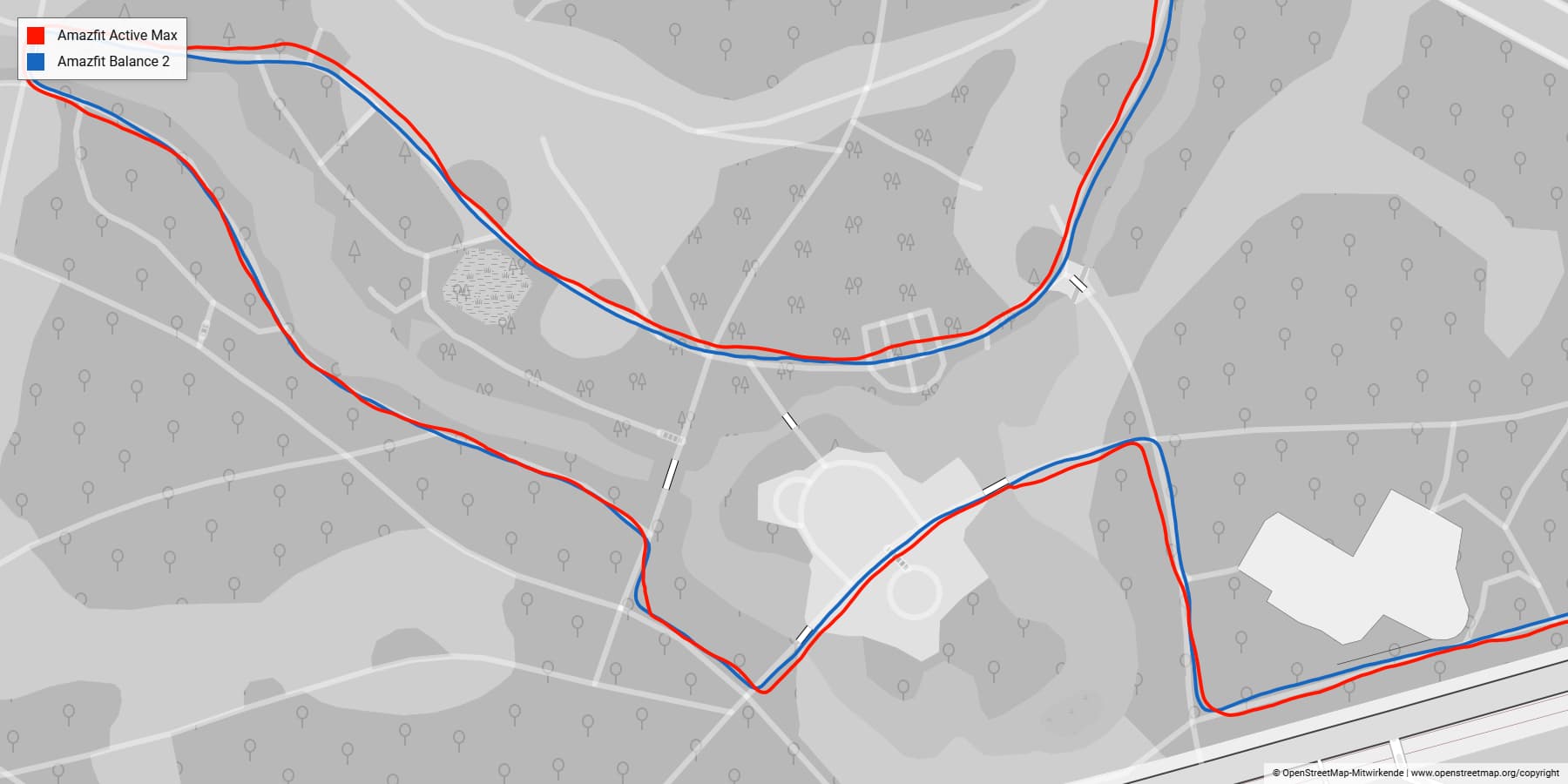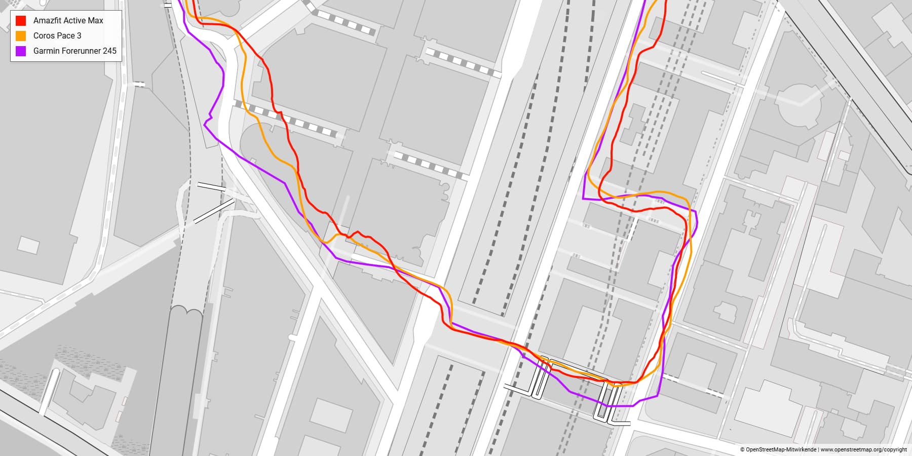 Um es besser einzuordnen: Die Active Max ist nicht schlechter als andere Uhren mit Single-Band-GPS. Zum Vergleich habe ich einmal die betagte Forerunner 245 von Garmin mitgenommen.