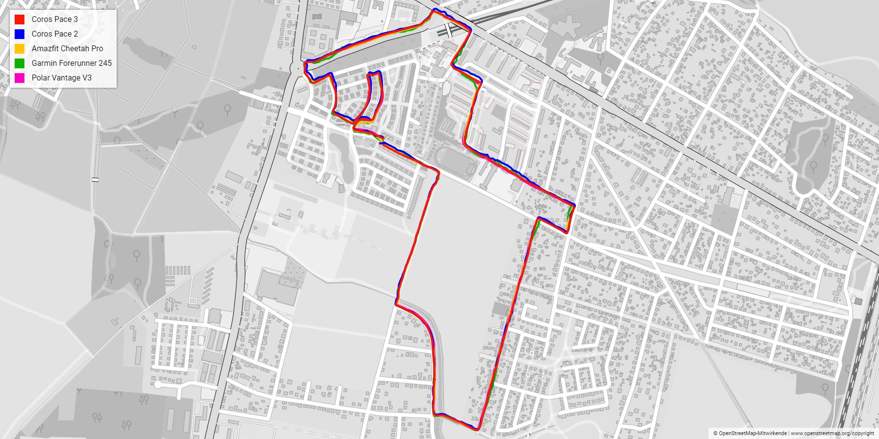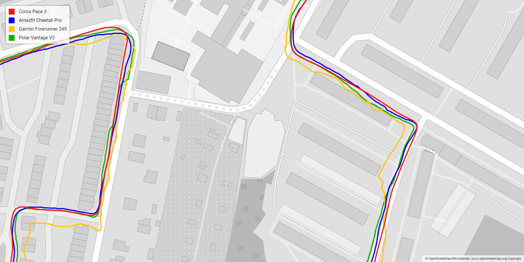 Geht man ein bisschen näher dran, werden die Unterschiede zur Forerunner 245 deutlich, während die Pace 3 ein sehr gleichmäßiges Bild zeichnet. So gerade wie die Linien teilweise verlaufen drängt sich der Verdacht auf, dass Coros die Werte ein wenig glättet. Von mir aus, dürfen das Uhren gerne machen, um die Ungenauigkeit der Standortbestimmung auszugleichen.