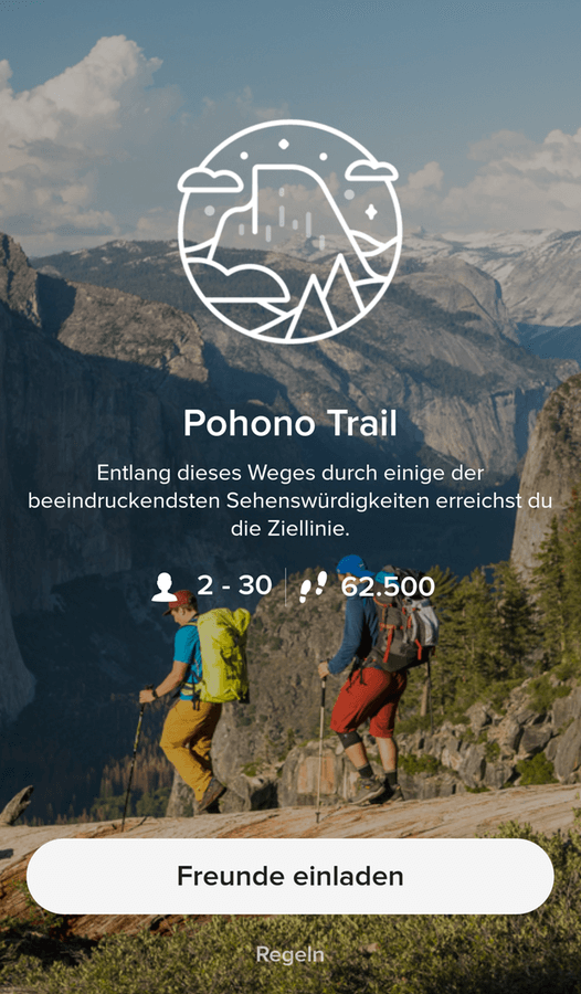 Die Abenteuerrennen umfassen mit dem Pohono Trail und dem Valley Loop zwei virtuelle Wanderwege aus dem Yosemite Nationalpark, die im Wettbewerb mit bis zu 30 Freunden bewandert werden können. Die tägliche Schrittzahl bringt einen dabei auf dem Weg immer ein bisschen weiter. An sich finde ich das eine tolle Idee, die auch vergleichsweise gut umgesetzt ist, aber eben nicht für Kinder. Als Erwachsener habe ich mich an den auf der Strecke liegenden Etappenzielen erfreut, die mit einem Panoramabild belohnt werden. Bestimmt gibt es Kinder, die sich auch davon begeistern lassen, aber ich kann mir Wanderungen vorstellen, die noch kindgerechter sind. Seien es Wanderungen mit Lerninhalten oder mit Geschichtencharakter und dann z.B. auch fernab von reellen Trails.