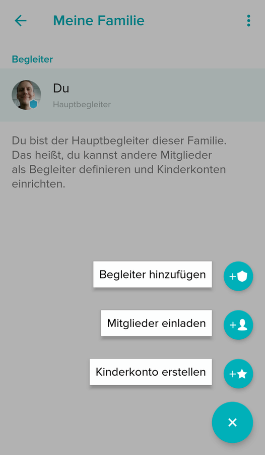 Begleiter sind Personen, die das Recht haben Konten von Kindern einrichten und löschen, die Tagesstatistiken der Kinder einsehen, Mitglieder einzuladen und weitere Begleiter hinzuzufügen. Kurzum: Ein Begleiter verwaltet die App für die Kinder. In der englisches Version der App übrigens der Begriff „Guardian“ verwendet, der in meinen Augen besser beschreibt, welche Aufgabe dem Nutzer mit dieser Rolle zukommen, nämlich darüber zu wachen, wer mit dem Kind im Fitbit-Universum interagiert und seine Daten einsehen darf. Jeder der ein „normales“ Fitbit-Konto besitzt, ist automatisch Hauptbegleiter seiner Fitbit-Familie.