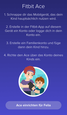 Mit dem Kindkonto kann anschließend der Fitbit Ace verknüpft werden. Und auch nur mit diesem, denn bei der Einrichtung wird kein weiteres Modell zur Auswahl angezeigt. An dieser Stelle funktioniert die Einrichtung dann wie gewohnt. Die App leitet zielgerichtet, knapp aber gut beschreibend durch die Einrichtung.