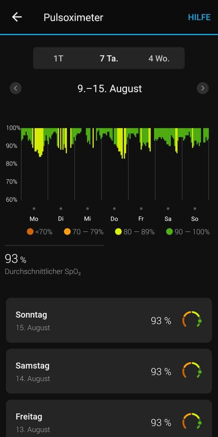 Bei den weiteren Detailansichten unterscheiden sich die Art der Daten häufig voneinander. Bei der Herzfrequenz zeigt die zweite Detailseite die Ruheherzfrequenz der vergangenen Tage an. Aussetzer habe ich weder während des Sports noch im Alltag bemerkt. Fairerweise muss man aber auch sagen, dass das kurze Armband für einen strammen Sitz der Uhr gesorgt hat. Von Nachteil war das sicherlich nicht.