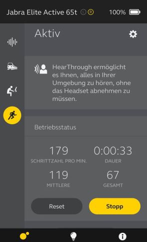 - Im Elite Active 65t ist ein Bewegungssensor verbaut, der Schritte registrieren kann. Diese können dann mittels der Sound+ App von Jabra aufgezeichnet und später mit Google Fit geteilt werden.