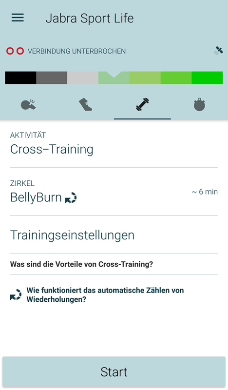 Die Wiederholungen mancher Übungen erkennt Jabra anhand der Kopfbewegungen, so dass die Übung erst dann beendet ist, wenn alle Wiederholungen erkannt wurden. Alternativ kann man eine Übung natürlich auch manuell beenden und zur nächsten springen.
