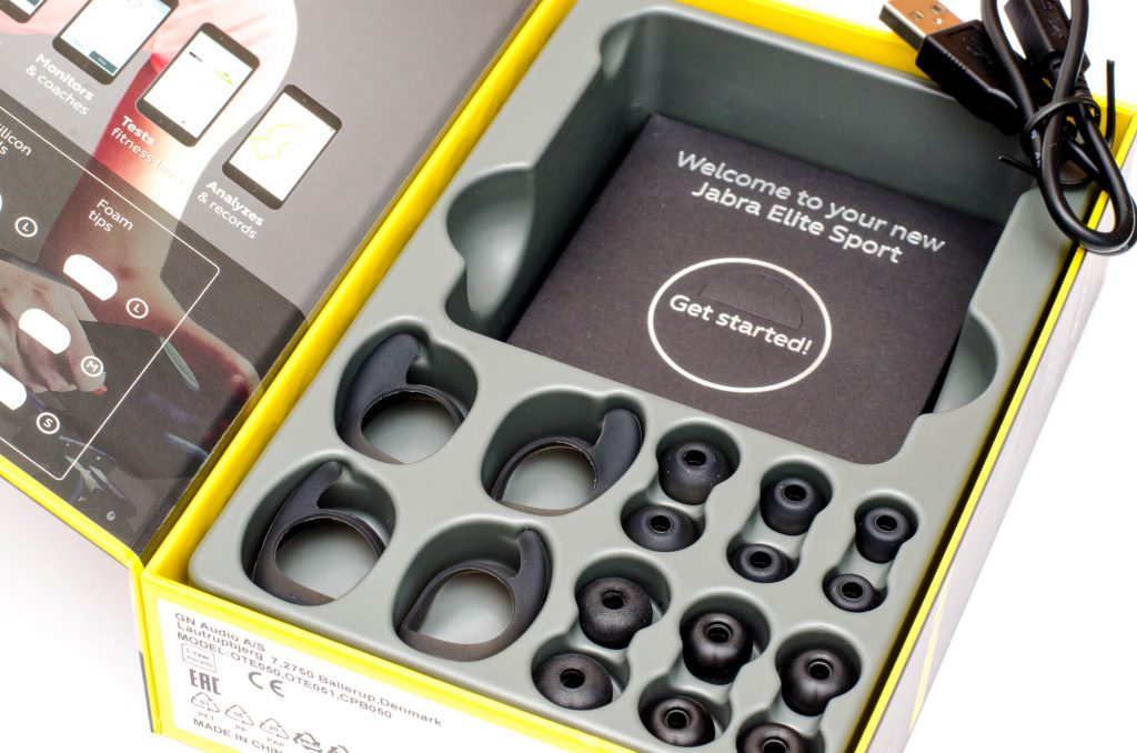Jabra liefert den Elite Sport Kopfhörer in einer etwa Taschenbuch großen Verpackung aus festem Karton, die im klassischen gelb-grauen Design des Herstellers gehalten ist.