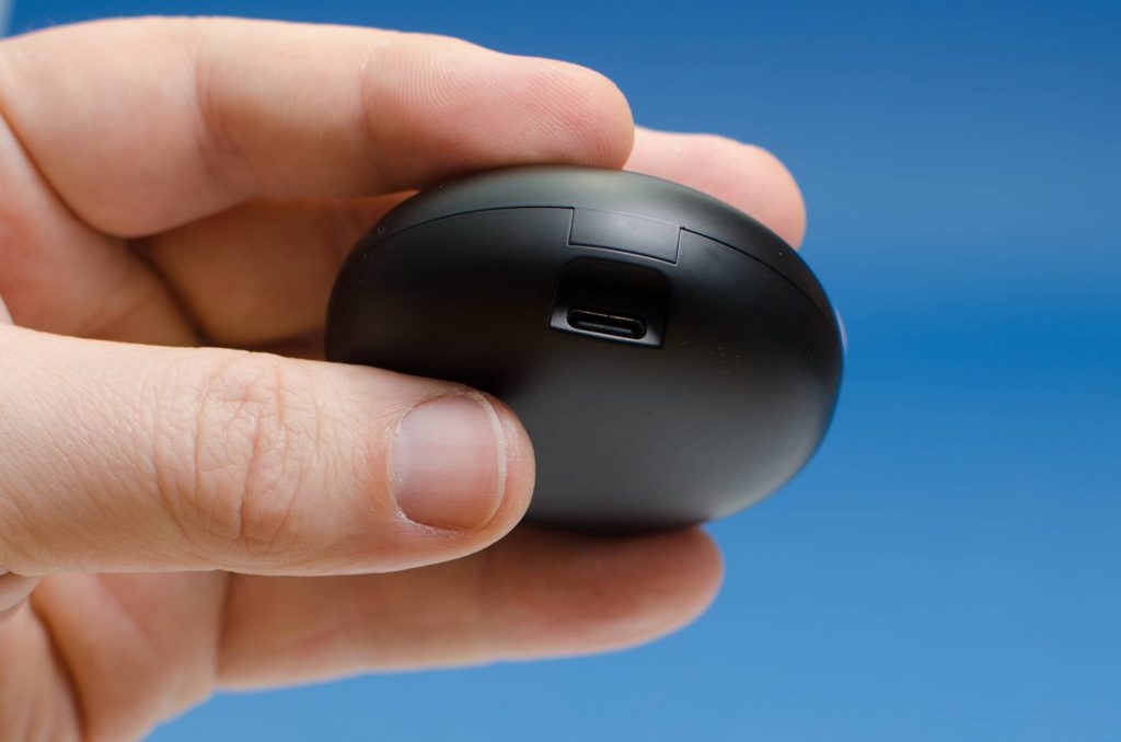 In der Verpackung befindet sich eine kleine, runde Box zur Aufbewahrung der Kopfhörer, die gleichzeitig portable Ladeschale ist. Der USB-C-Anschluss zum Aufladen befindet sich eingelassen in die Gehäuseseite. Ein kurzes USB-C-Kabel findet sich neben ein zwei weiteren Silikon-Aufsätzen unterschiedlicher Größe, sowie einer Garantiekarte.