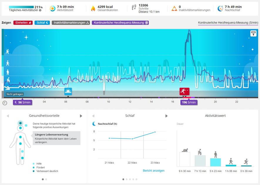 Beim Antippen des Displays wird die Detailansicht aufgerufen. Hier finden sich nicht alle Informationen, die die Ignite 2 bei der Vermessung des Alltags verwendet, aber eben doch einen guten Teil.