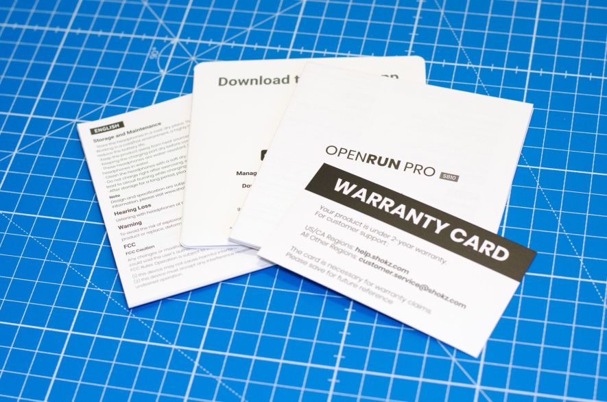 Shokz vertreibt den OpenRun Pro in einer ca. 14 x 17 x 7 cm großen Verpackung. Auf der Vorder- und Rückseite sind die Kopfhörer abgebildet. Zusätzlich finden sich ein paar Leistungsbeschreibungen auf der Rückseite: